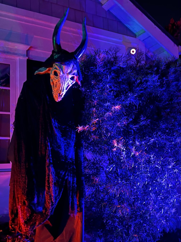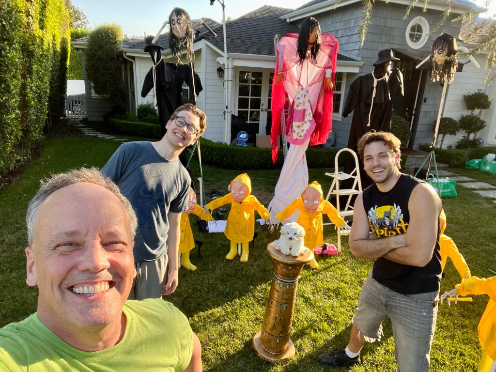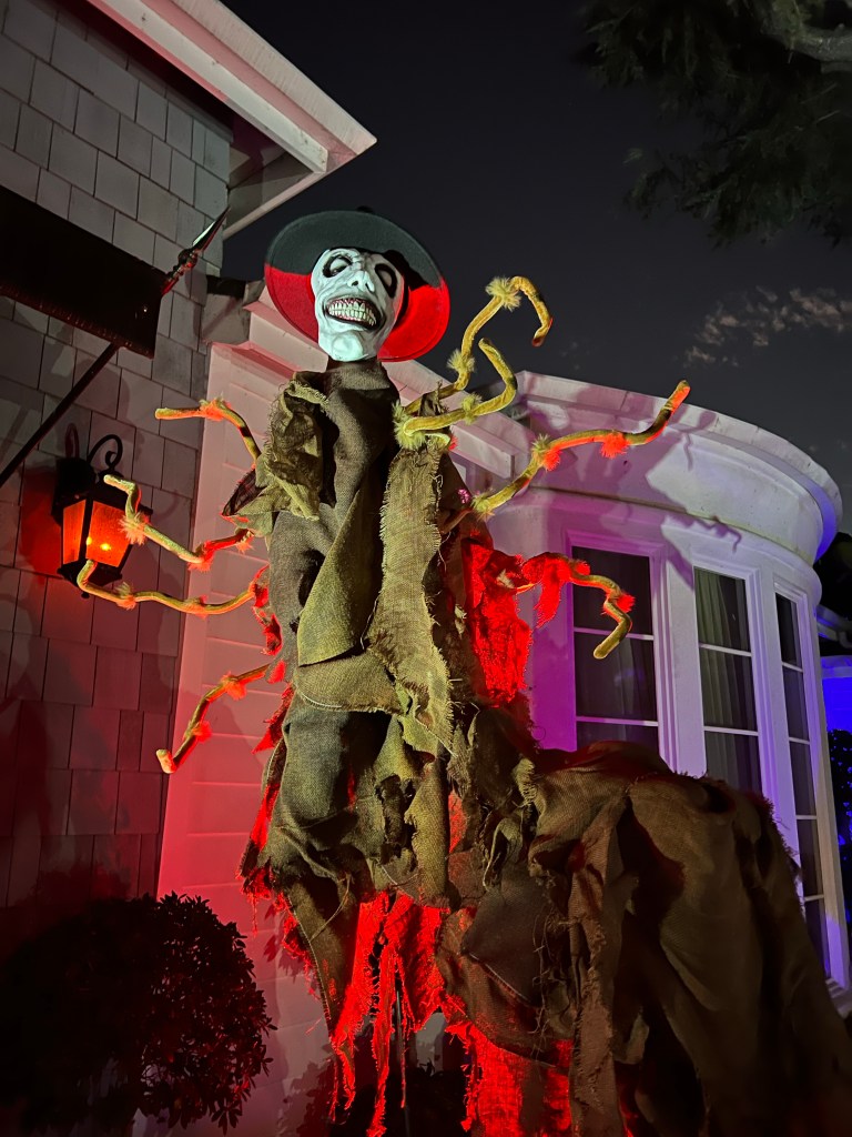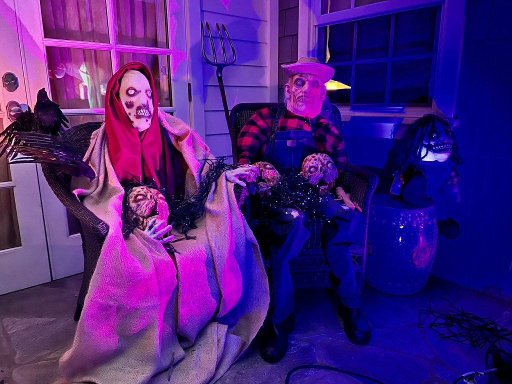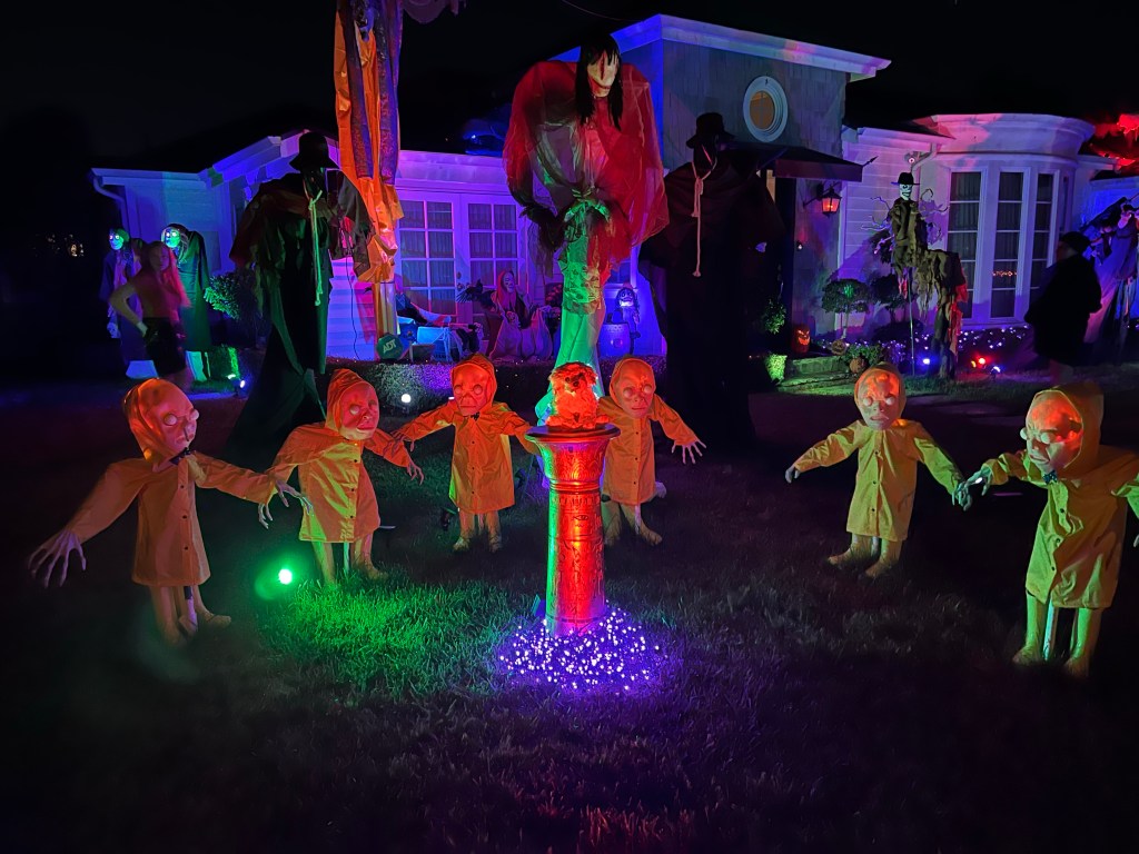 The central tableau was one of a rather disturbing mother figure hovering over her brood of six rain slicker-clad children all focused on a sweet, little puppy dog perched on an Egyptian pedestal. As with most of my yard, it doesn’t refer to any particular show or movie, though I must admit that Cronenberg’s “The Brood” was some inspiration.