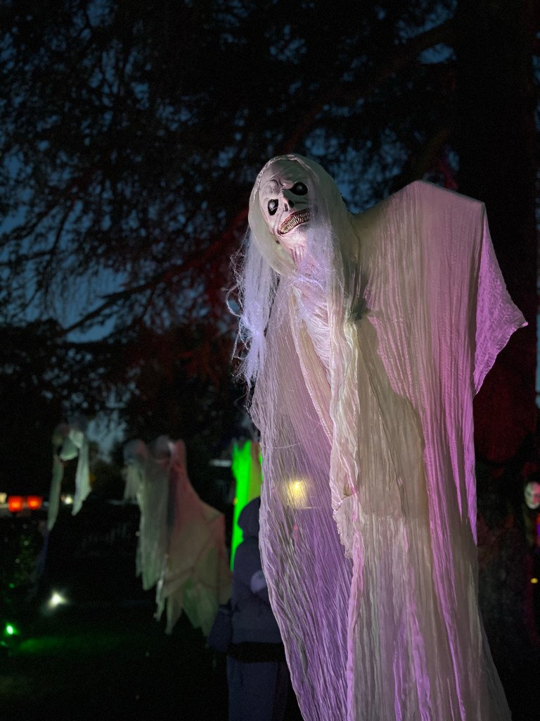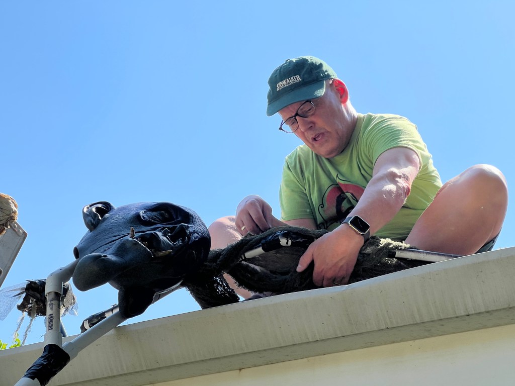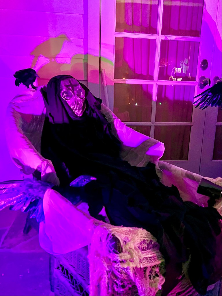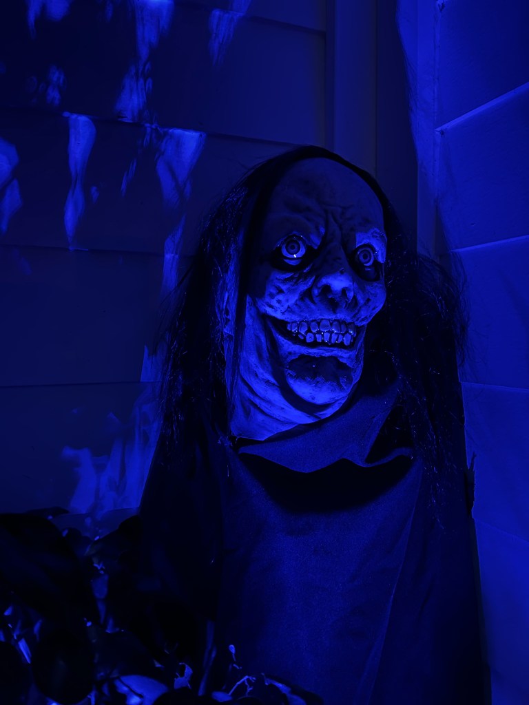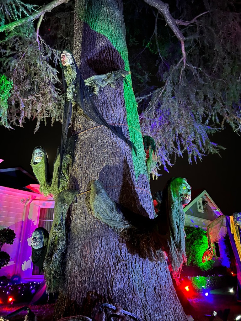 The central tableau was one of a rather disturbing mother figure hovering over her brood of six rain slicker-clad children all focused on a sweet, little puppy dog perched on an Egyptian pedestal. As with most of my yard, it doesn’t refer to any particular show or movie, though I must admit that Cronenberg’s “The Brood” was some inspiration.
