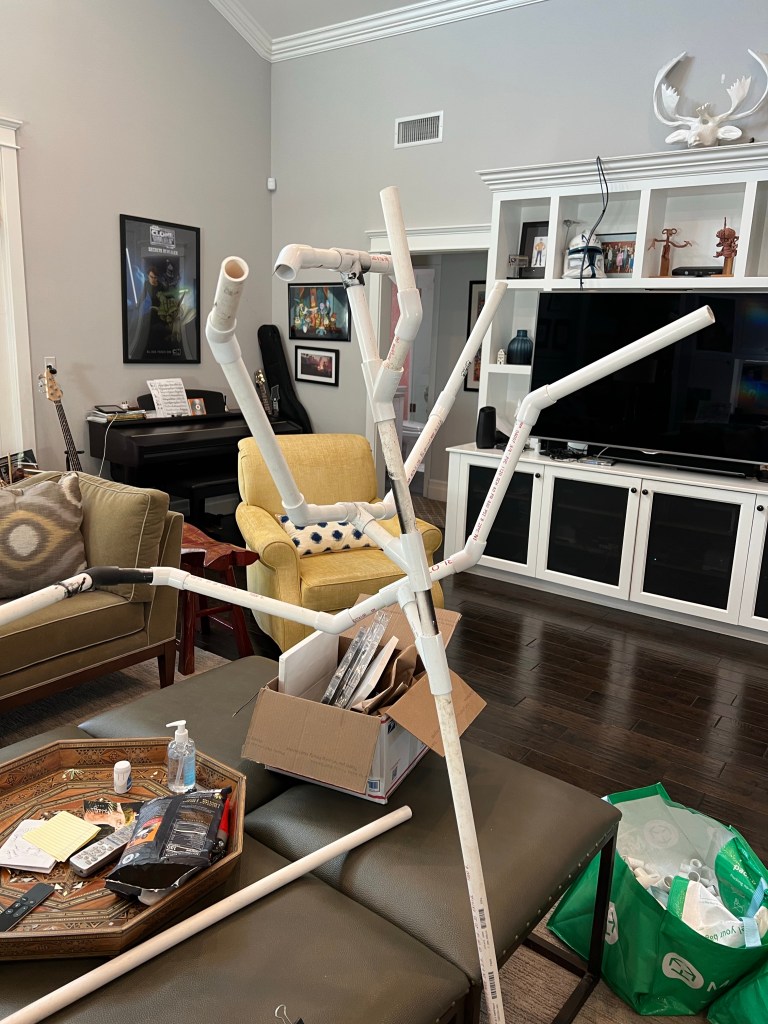 2022 I had great fun deploying a couple fresh design ideas- tree hangers as well as a “spider leg spine” effect that I got by simply lashing a giant spider to the PVC spine of a few creatures. I also used an odd group figure idea that got a great response from passers by!