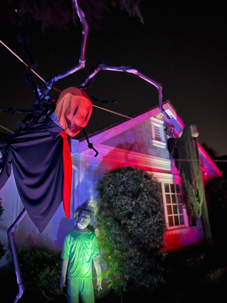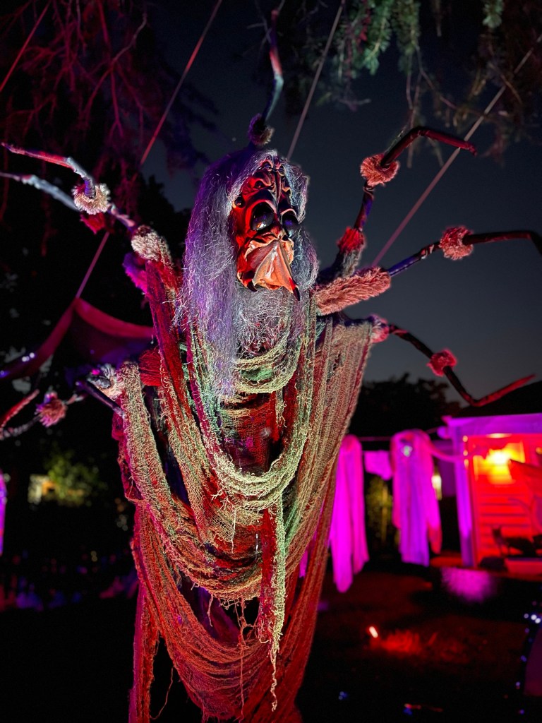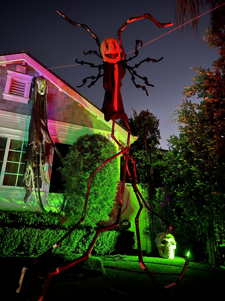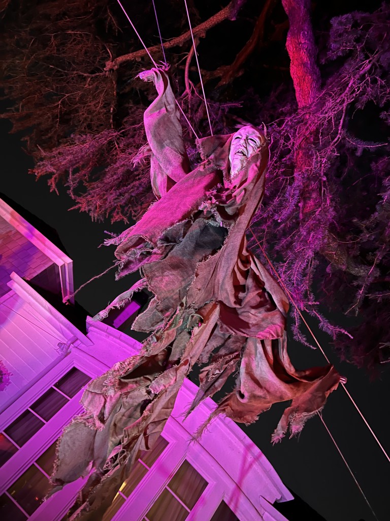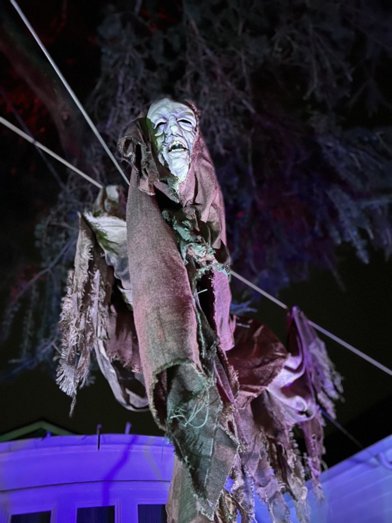 This year’s creepy yard’s new idea was less about creature innovation and more about improved presentation and easier maintenance. I strung up a bunch of nylon ropes high above to serve as a kind of scaffolding to hang creatures, as opposed to planting them all in the ground. This not only raised the sightline of the yard for those viewing from the street, but it also allowed lighter creatures that utilized less PVC and fabric. The idea was also to be less vulnerable to wind and water, which along with gravity I’m always battling with what I’ve set up.