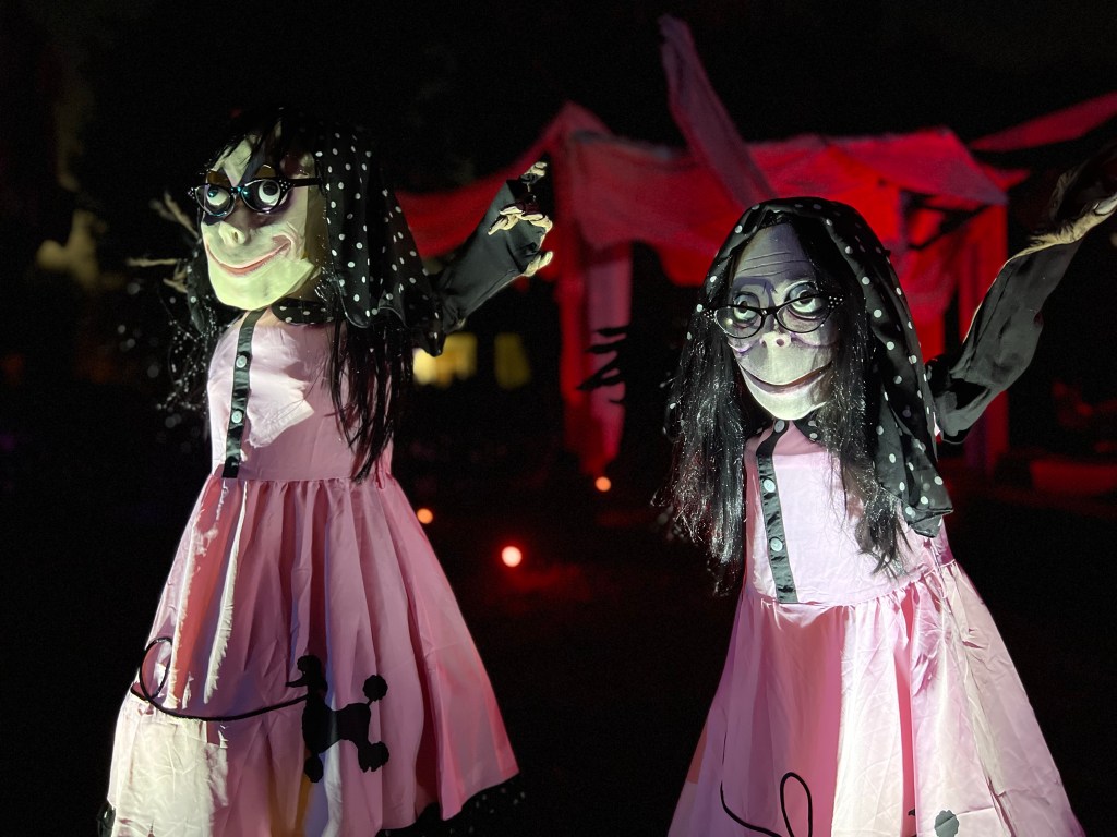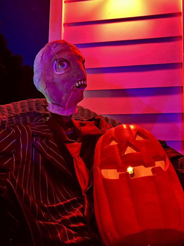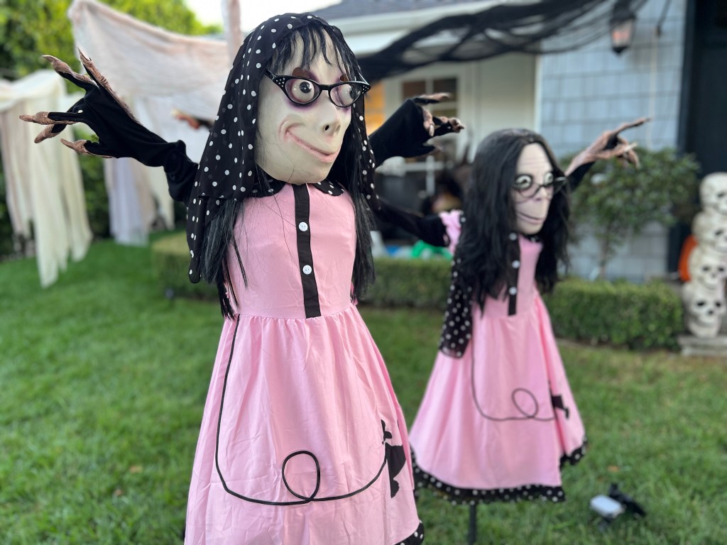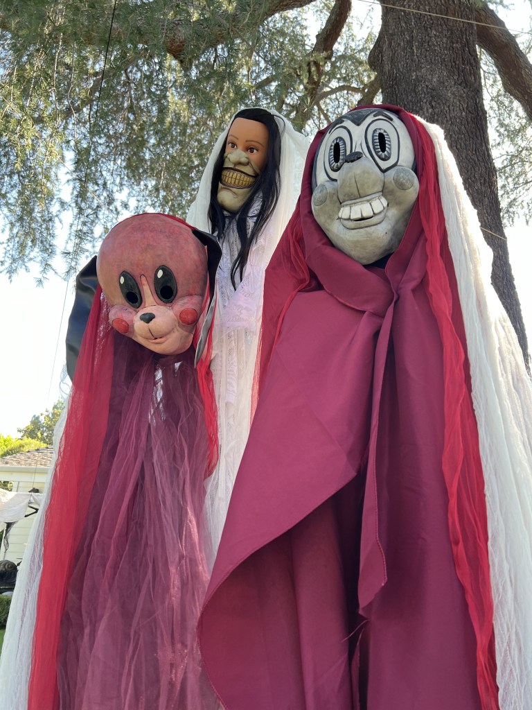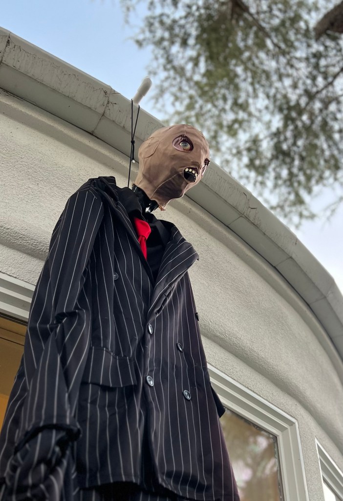 The poodle skirt Momo-faced twins are the outcome of an idea I originally had but ended up abandoning- an alien mental asylum where the inmates were mounting a production of the musical “Grease.” Also downstream from this idea, the soundtrack to this year’s creepy yard will be mournful doo-wop. The tall skinny suited thing was my run at creating a “slender man” variation, which looks more like a stretched-out baby from Lynch’s “Eraserhead.”
