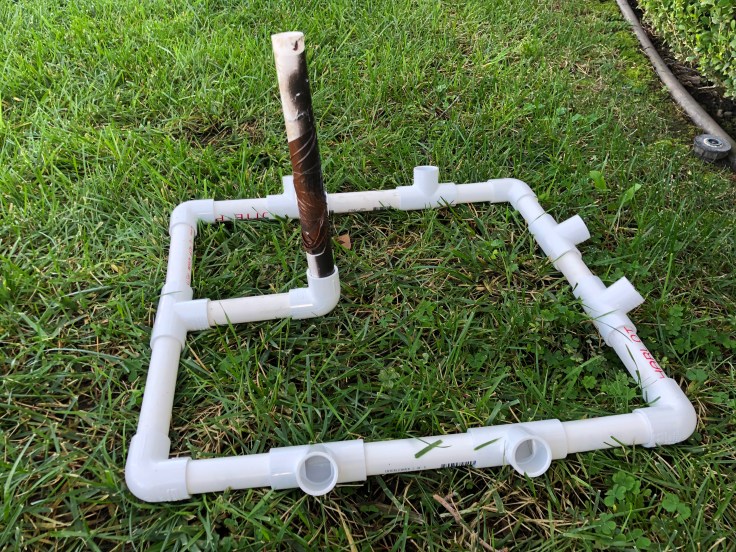 I came up with the idea for these from the baby doll-robot spider thing in “Toy Story.” I wanted something more insect like. I started by making a square-ish frame, with “T” couplings for six legs.