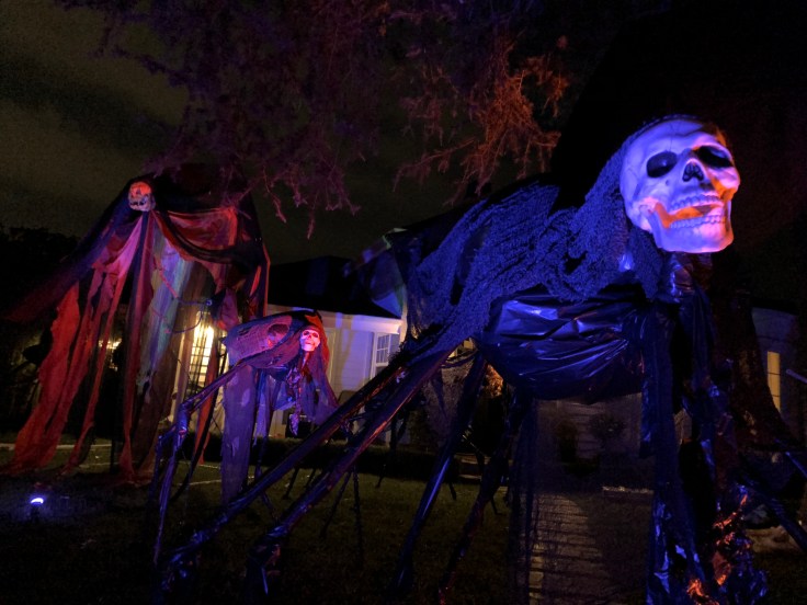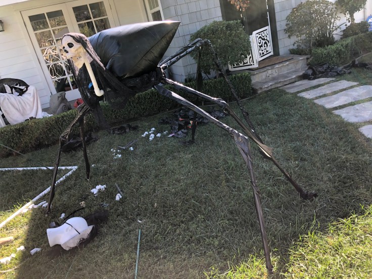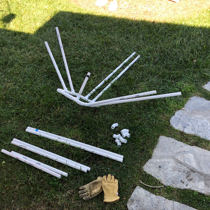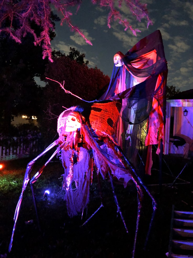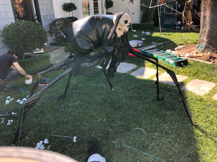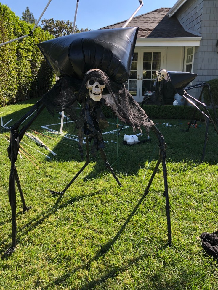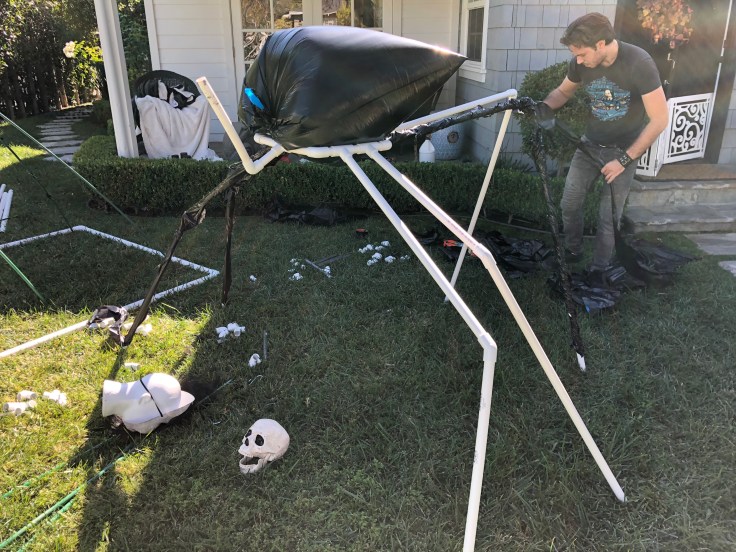 I tried to proportion the legs to look more like a spider or insect with the leg pairings to each side of the creature symmetrical. I thought of covering the white PVC legs with strips of black garbage bag to give them a slick, “black widow” kind of look. My nephew Braxton and friend AJ helped me assemble and added a few creative ideas of their own.