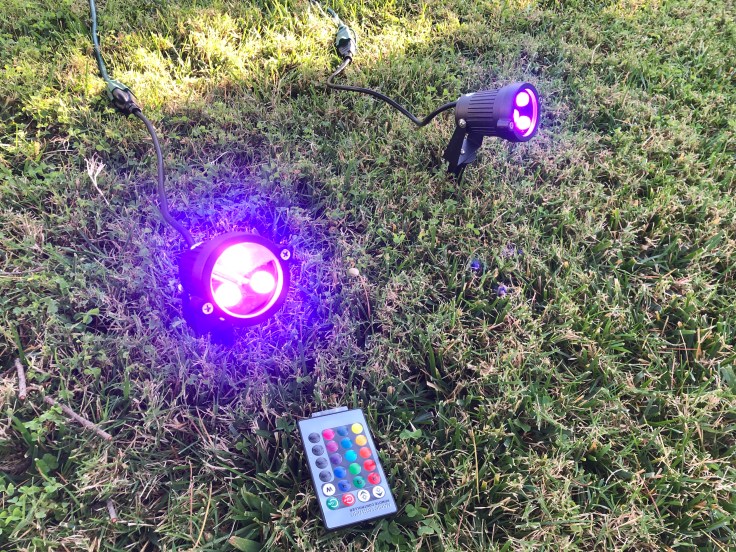 This year I tried the Ourleeme lawn flood lights which are LED and can be switched to different colors with the included remote. Inexpensive on Amazon. I just stake them into the lawn and point up at the creature. You can also pay a bit more for the kaleidoscope version to mix things up. Low angle beam focused on the face of the creature always looks spookiest!