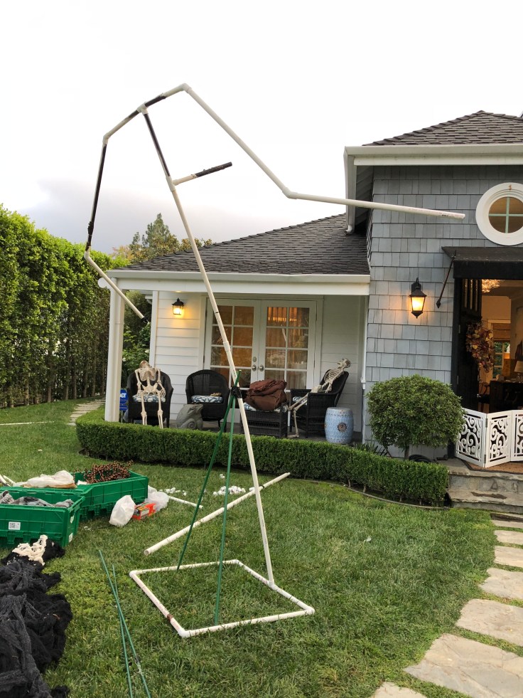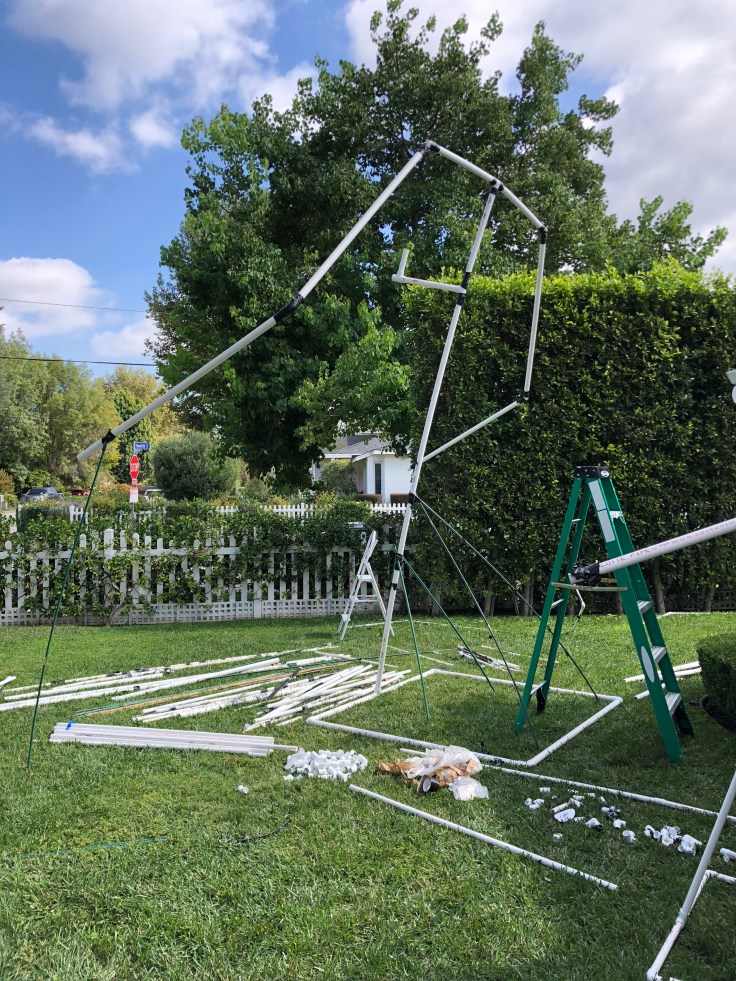 This is big and heavy enough to merit four green garden stakes duct taped to its spine for support, as well as one stake at the end of each arm. They’re green and aren’t that noticeable and you’ve got to make sure your structure is going to hold up against wind and gravity!