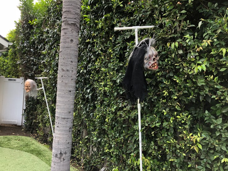 It’s a simple PVC frame with a neck, fabric and a mask with good sized office clips to hold the fabric together and obscure the frame. Masks are mostly from FrightProps.com, but I got them else where too. It’s important to use a garden stake or two to steady the witch’s skeleton against the wind or gravity or even heaviness brought about by a sprinkler getting the fabric wet.
