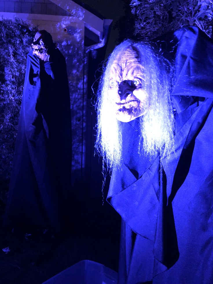A single LED colored spotlight stuck in the ground completes the effect at night. It’s nice when the witches sway in the breeze, looking almost alive.
